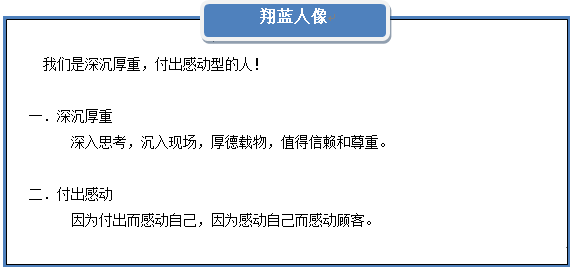 | (1) | 我们在万物流转的世界中,聚集的不是金钱,而是顾客的感谢。 顾客的成长是我们的目的,顾客的喜悦是我们的动力,一声“翔蓝人辛苦了”是我们最大的收获。 |